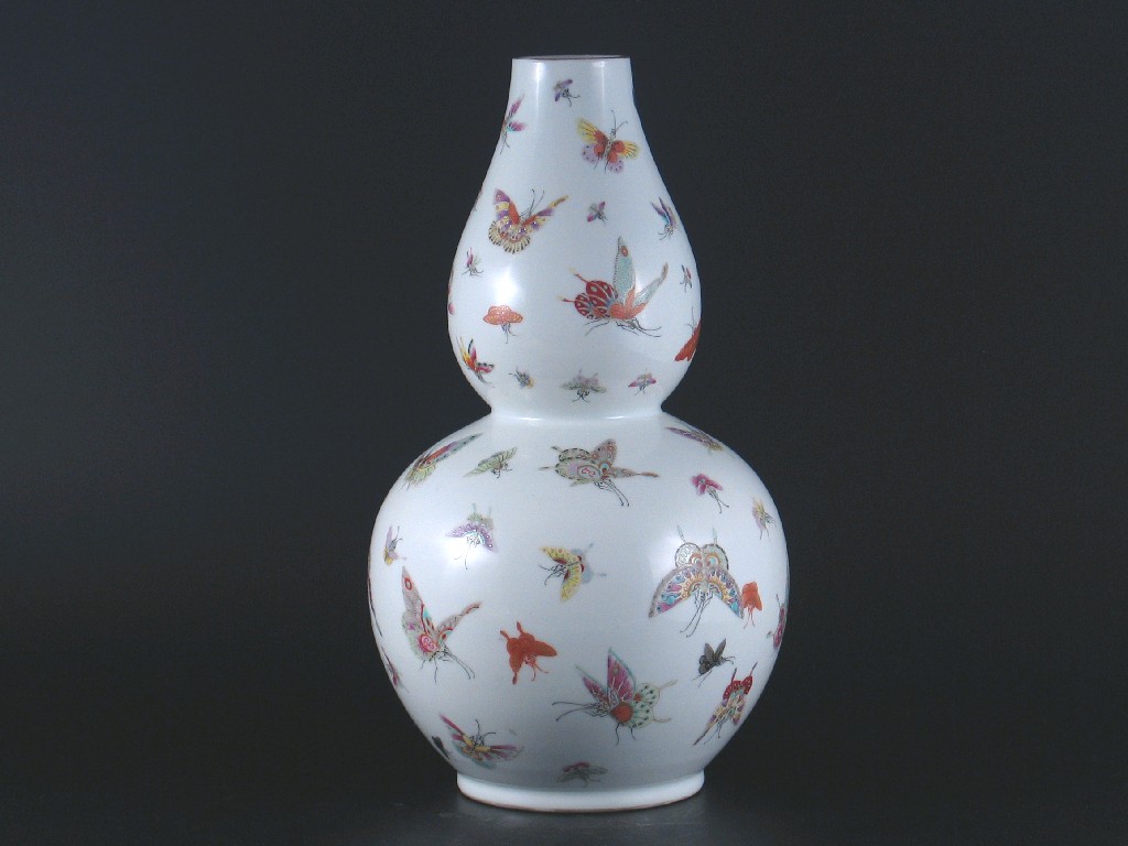 A Chinese famille rose double gourd vase, decorated with numerous butterflies, Qianlong four character mark but later, 36cm.