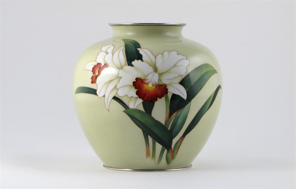 A Japanese Ando Jubei cloisonn? vase, decorated with a large flowering orchid on pale green ground, silver mounts to the rim and foot, punch mark and circular factory mon, 20th century, a bruise beneath the foot, 18cm.
