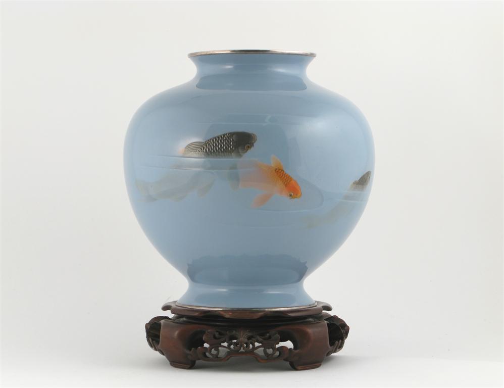 A good large Ando Jubei silver-mounted musen enamel vase, decorated with four carp rising from their murky waters which form the blue ground, the base with a punch mark and a circular factory mon, 1st half 20th century, together with a wood stand, 24.5cm. (2)
