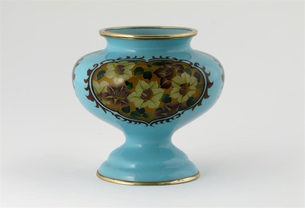 An unusual Japanese enamel vase, the body with three heart-shaped plique ? jour panels of flowerheads, set against a pale blue ground, Meiji 1868-1912, 12cm.