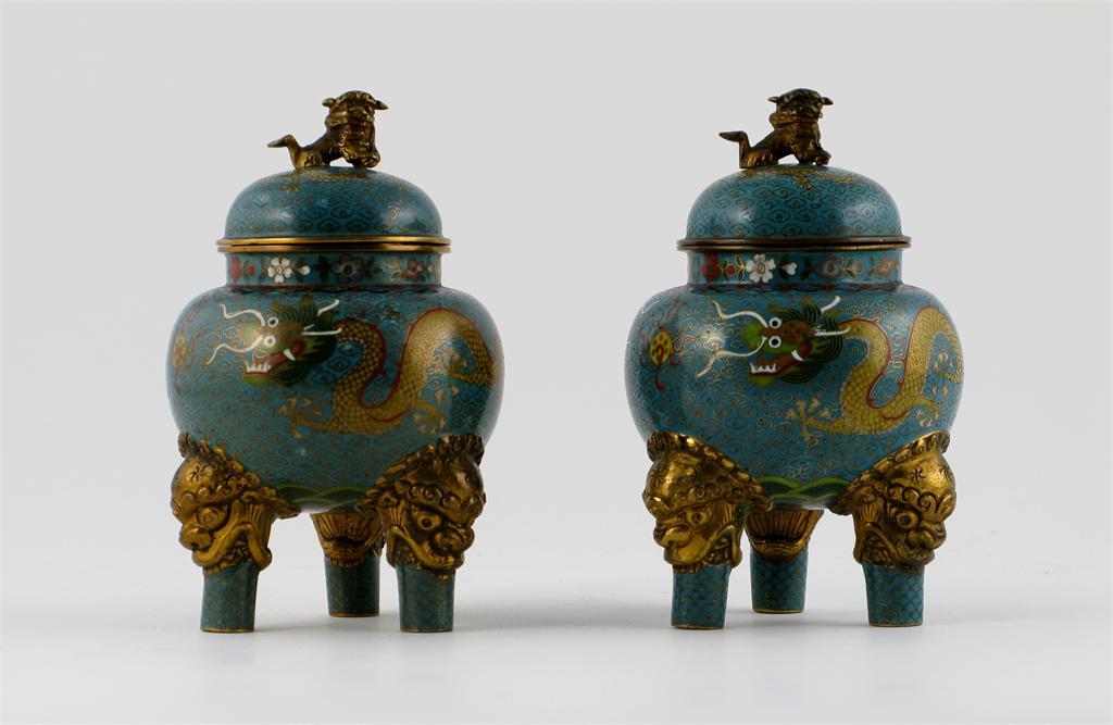 A pair of Chinese cloisonn? tripod censers and covers, each decorated with dragons chasing flaming pearls, 19th/20th century, 12.5cm. (4)