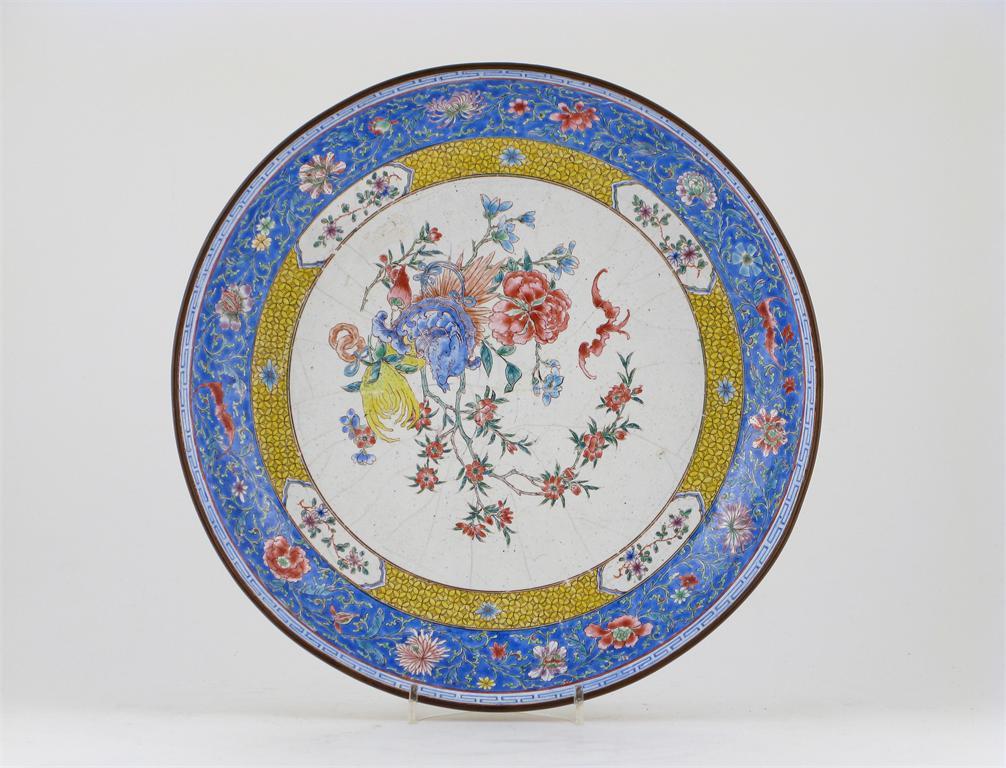 A Chinese Canton enamel dish, the centre brightly decorated with a finger citron, a bat, a fabulous fish and blossom, the reverse with two dragons in combat, surrounded by a yellow ground border with bats amidst scrolling flowers and foliage, firing cracks and repairs, 19th century, 26.4cm.