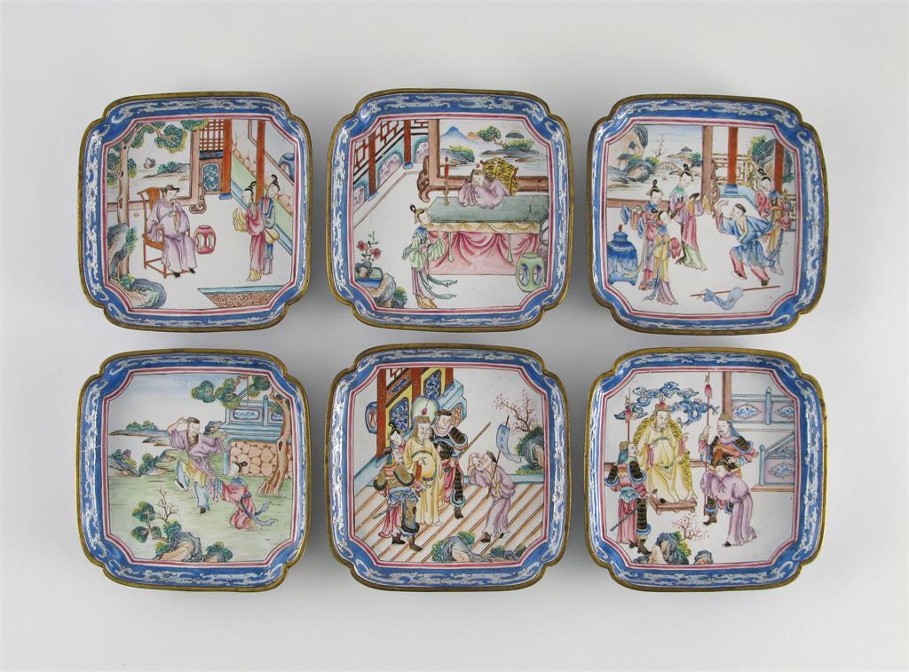 A set of six Chinese Canton enamel famille rose square dishes, with indented corners, depicting scenes of court life, with mythical dragon borders, the backs with crimson square marks, 18th century, small flaws to all dishes, 9.7cm. (6)