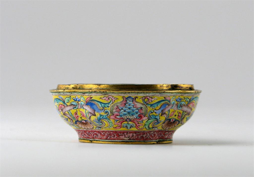 A rare Chinese Beijing enamel quatrefoil box base, finely painted with a design of pomegranates, shells, scrolls and ribbons on a yellow ground, above a rose border of leaf scrolls, gilded copper mounts to the rim and foot, 1st half 18th century, minor faults, 4.8cm.
