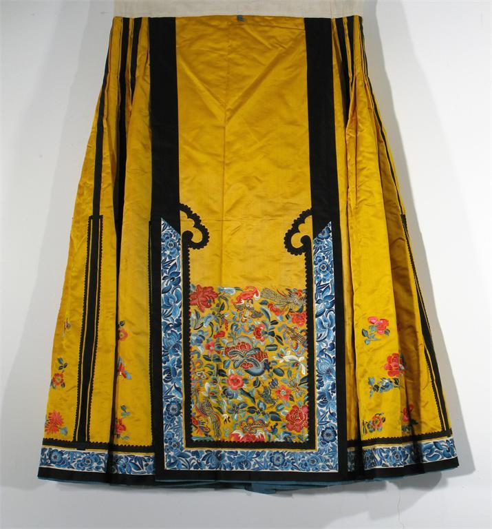 Two Chinese silk skirts, both embroidered with panels of birds, flowers and butterflies, one on an Imperial yellow ground, the other midnight blue. (2)