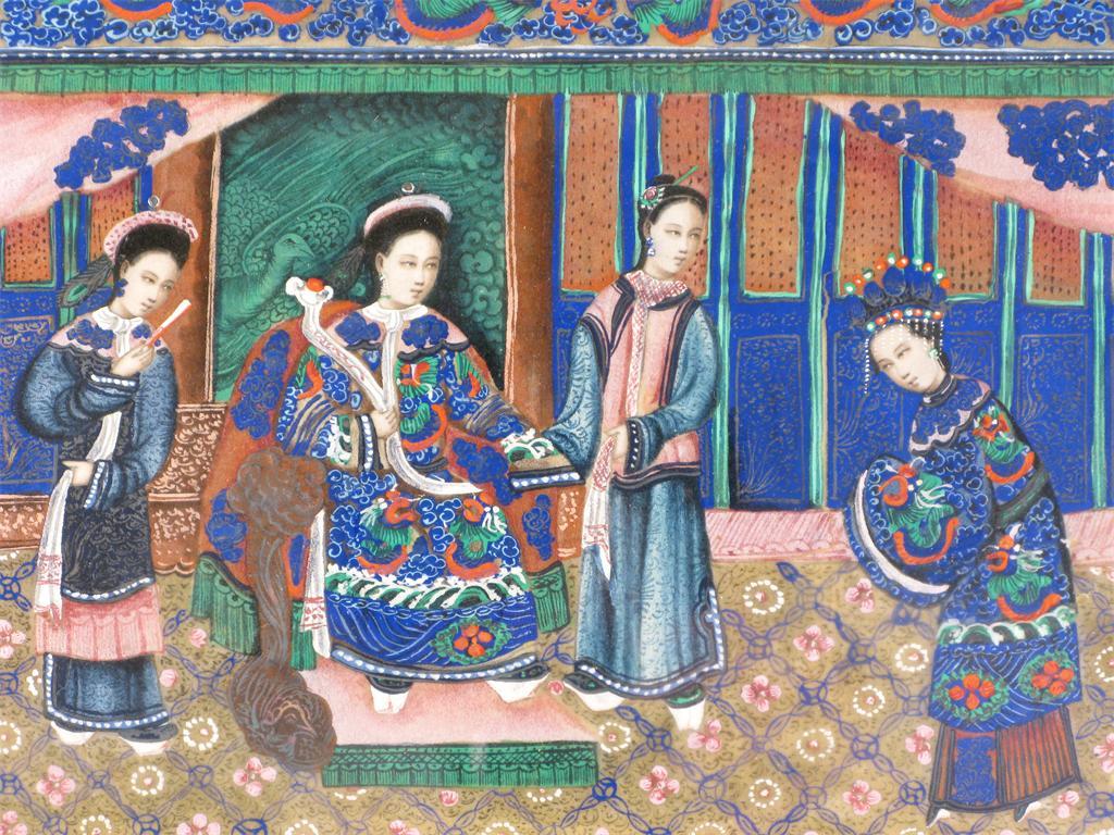 Four Chinese rice paper paintings, three depicting figures in interiors, the fourth of a pair of ducks, 19th century, some damages, 29cm. (4)