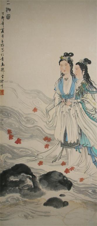 A Chinese painting on paper of a flowering prunus above rockwork and daffodils, extensive calligraphy and two red seal marks, three further Chinese paintings on paper, 20th century, 153cm max. (4)