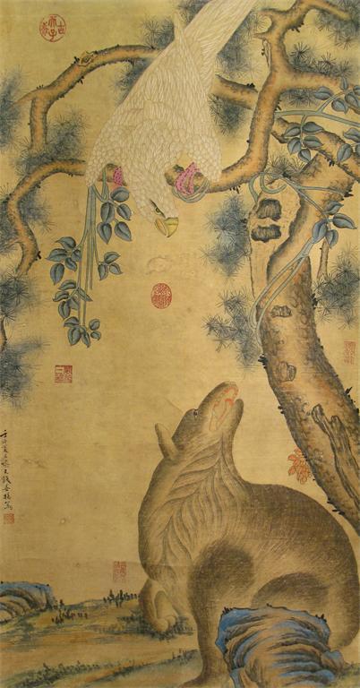 A Chinese scroll painting of a parrot looking down on a hairy beast