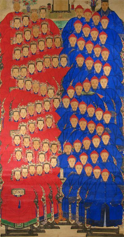 A large and rare Chinese scroll painting, depicting a family tree of five generations, the ladies dressed in red robes, the men in blue, each face accompanied by character marks, 19th/20th century, damages, 227cm x 120cm.