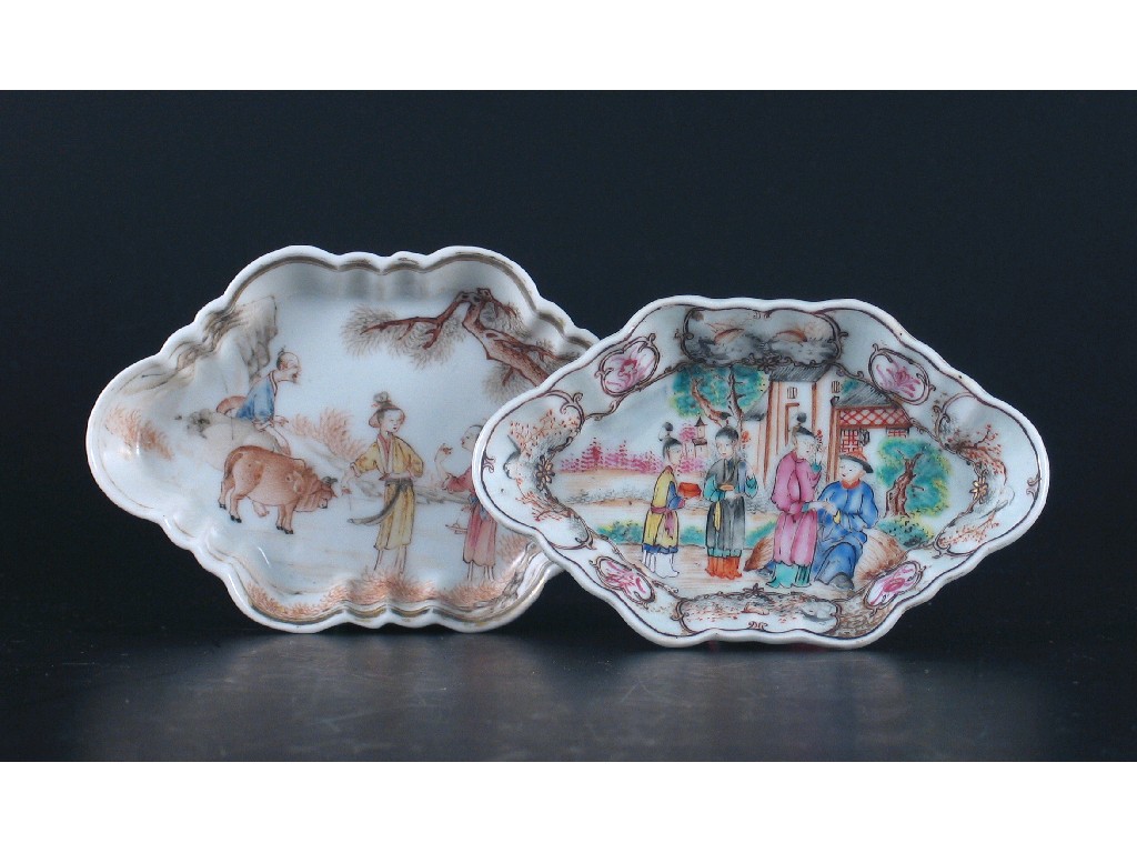 Two Chinese famille rose spoon trays, both decorated with figures, c.1760, 13.2cm. Max. (2)