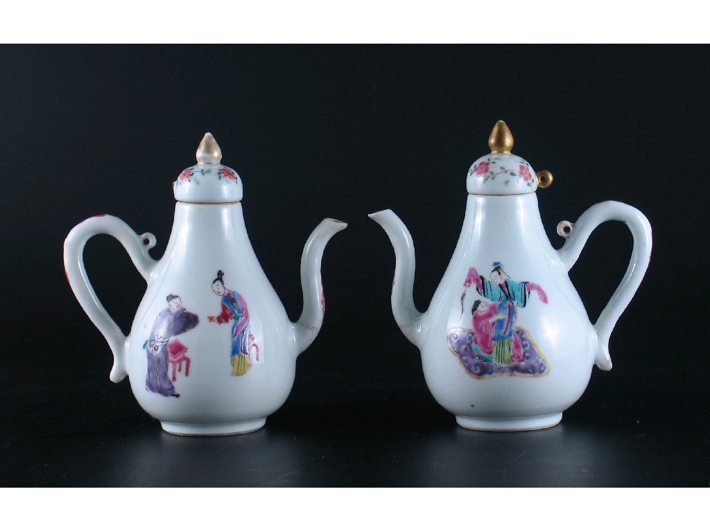 A pair of small Chinese famille rose ewers and covers, decorated with figures in various pursuits. Both with damages. 18th century, 13.5cm. (4)