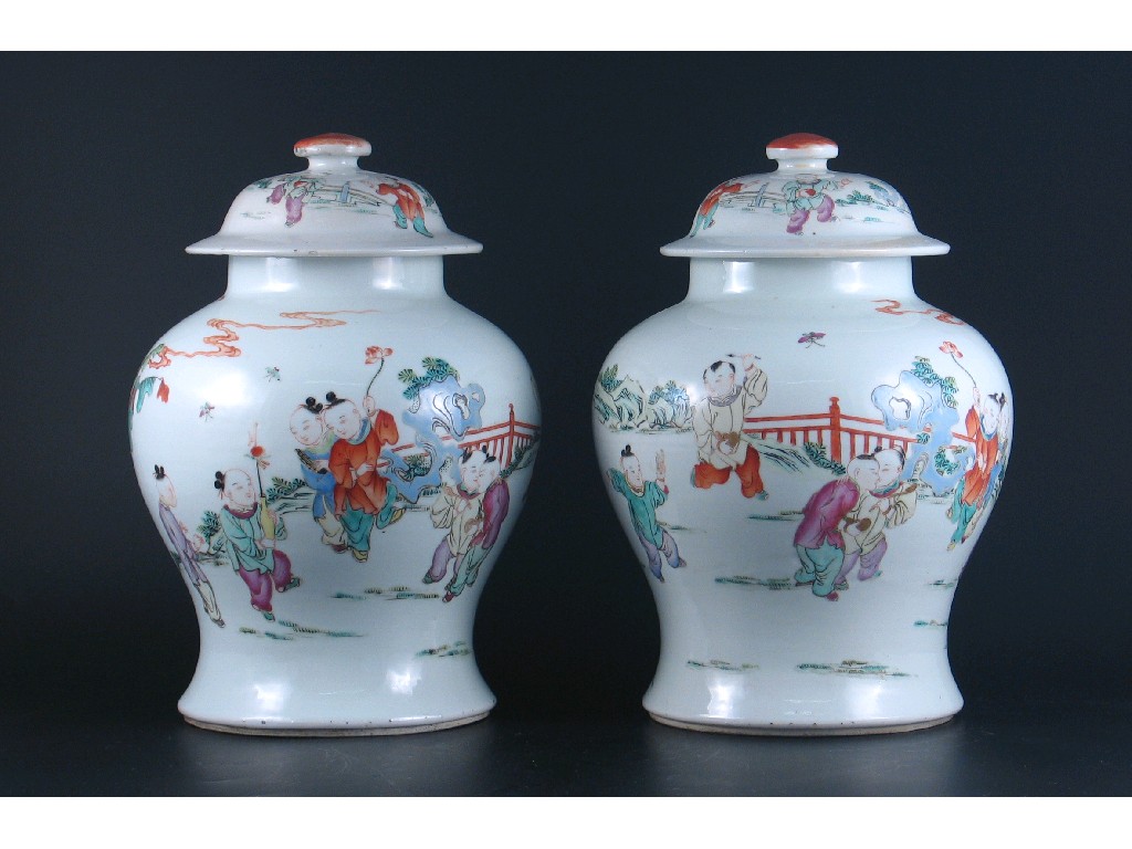 A pair of Chinese famille rose baluster vases and covers, decorated with children playing in gardens. A large re-glued chip to one rim. 19th century, 30.5cm. (4)