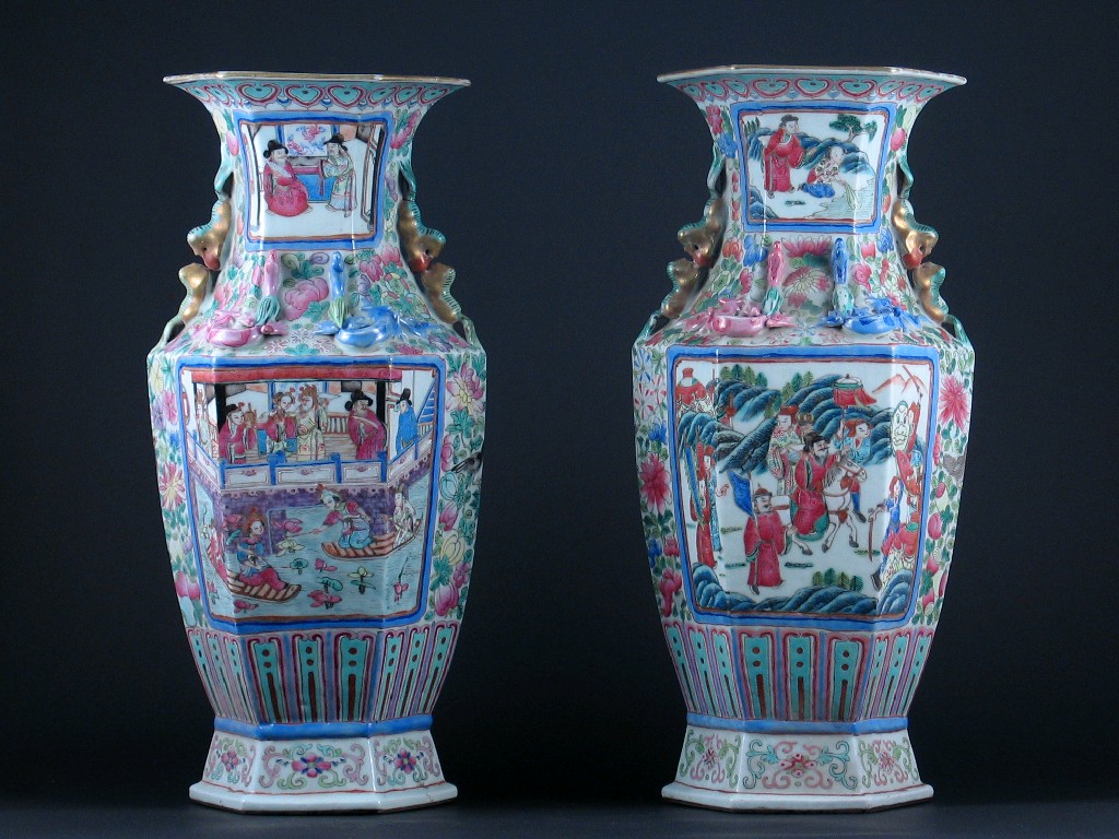 A pair of Chinese Canton famille rose hexagonal-section vases
