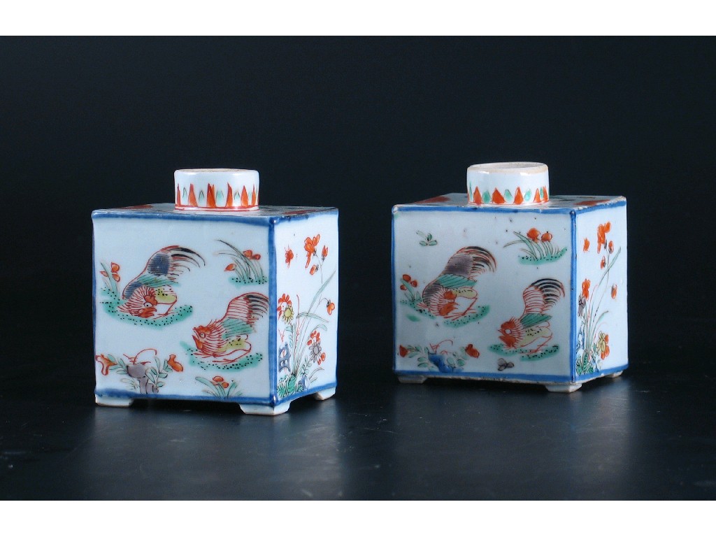 A pair of Chinese famille verte tea canisters, with rectangular bodies painted with scruffy cockerels scratching amidst flowers. A small repaired rim chip. Kangxi 1662-1722, 8cm. (2)