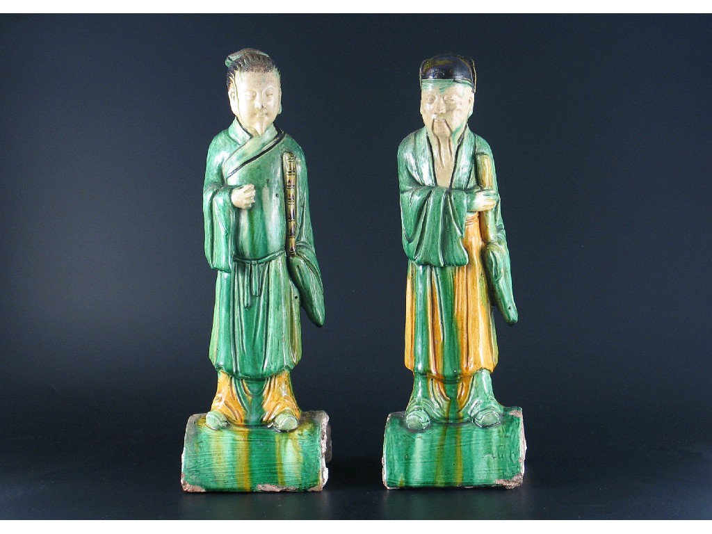 A pair of Chinese Ming dynasty pottery tile-work figures, each standing, one holding a scroll, the other a flute, decorated with green and yellow glazes, 16th/17th century, 41cm. (2)