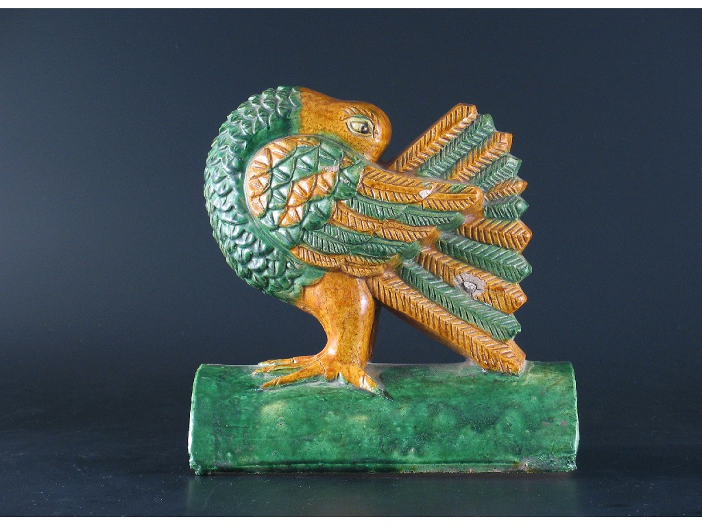 A Chinese tile-work model of a bird, with its head bent round between its wings and decorated with yellow and green glazes, probably Ming dynasty, 23cm.