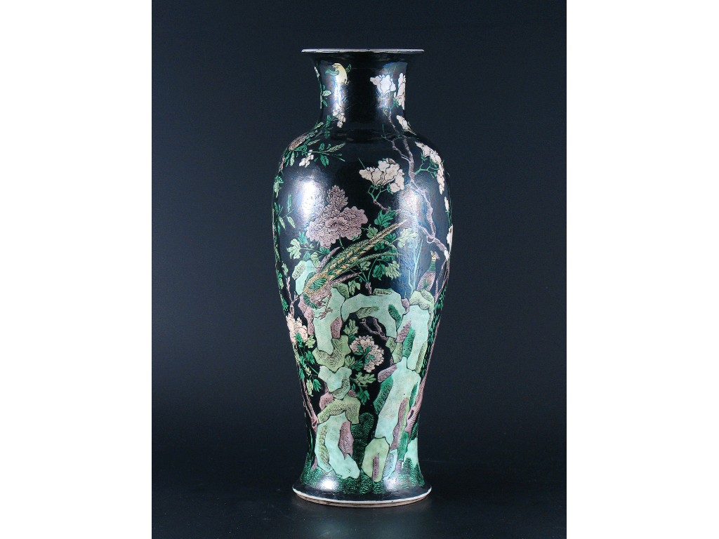 A large Chinese famille noire vase, decorated with birds perched on rockwork amidst peony. The black enamel possibly later. Six character Chenghua mark but Kangxi 1662-1722, 46cm.