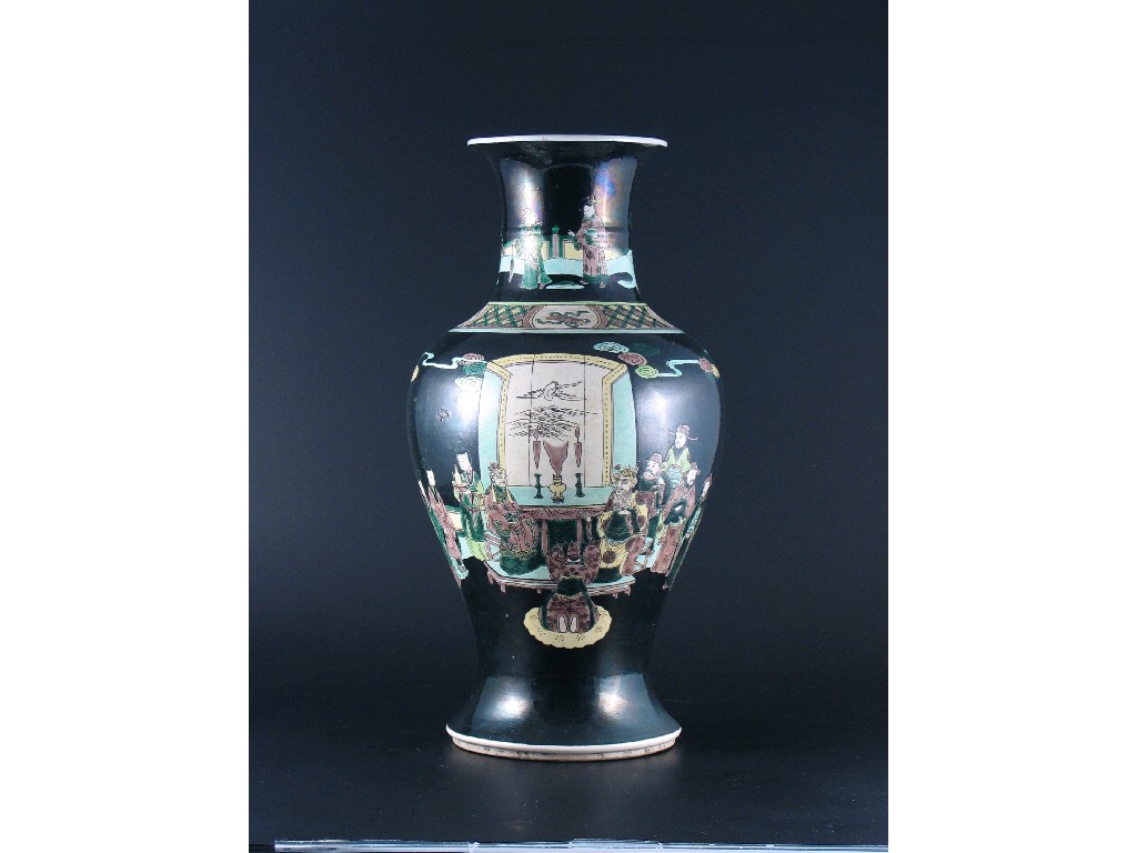 A Chinese famille noire vase, decorated with numerous figures in an interior. A crack to the neck. Chenghua mark but 19th century, 45cm.