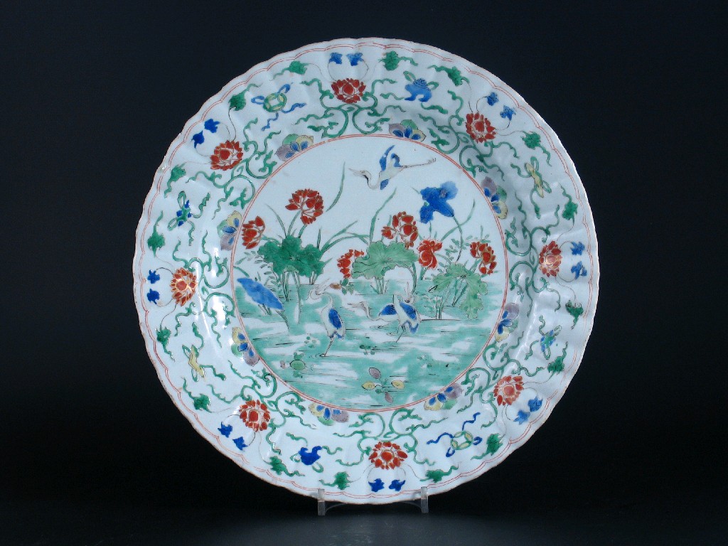 A Chinese famille verte dish, with a fluted rim, painted with four cranes amidst lotus, the border with flowers and auspicious symbols, lotus mark. Some surface wear and rim frits. Kangxi 1662-1722, 34.5cm.