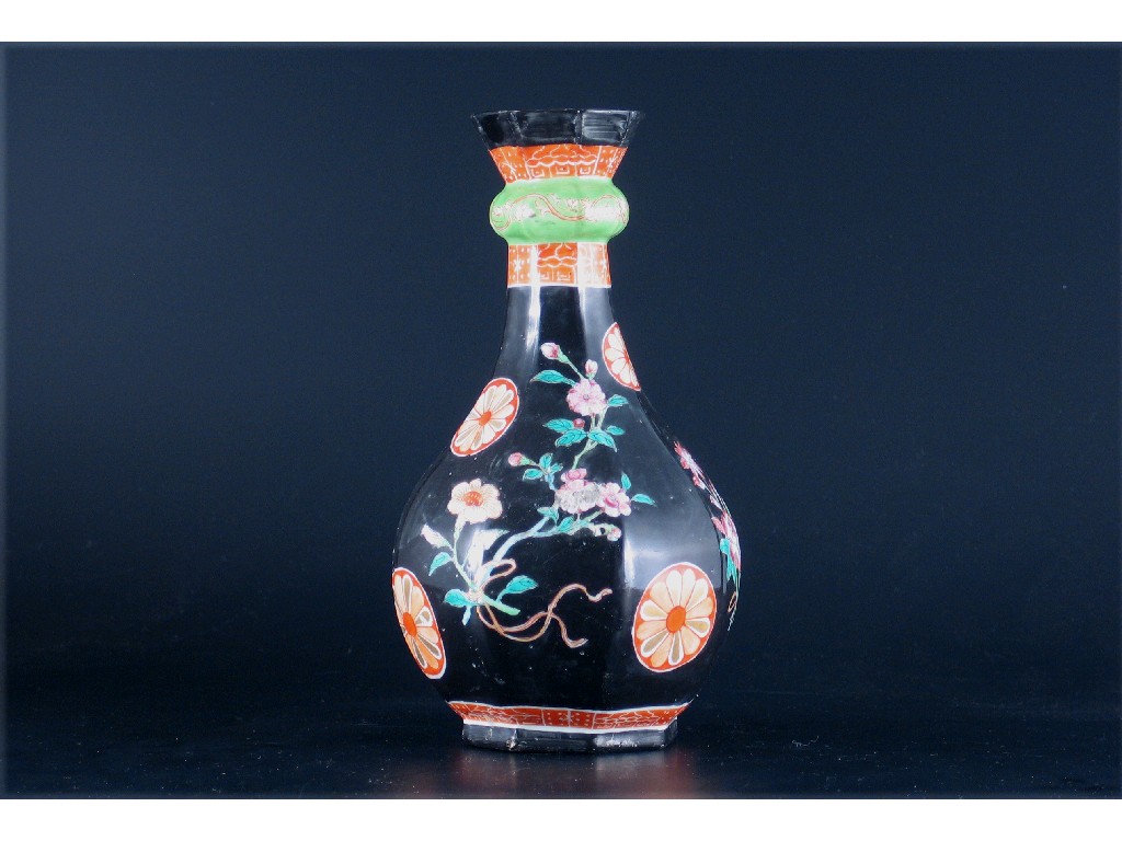 A famille noire octagonal-section guglet, decorated with peony, chrysanthemum and rondels. Some restored rim chips. 19th century, 24cm.