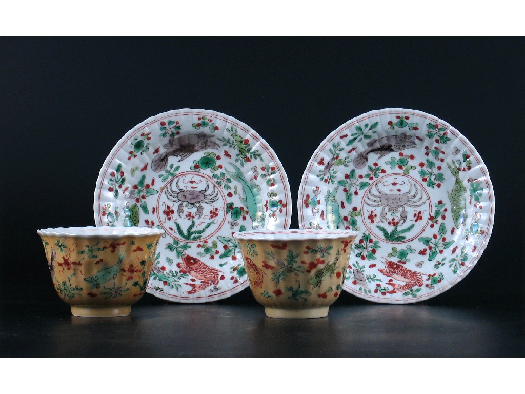 A pair of Chinese famille verte moulded teabowls and saucers, decorated with fish and crabs amidst waterweeds, the exteriors caf au lait. One saucer cracked. Kangxi 1662-1722. (4)