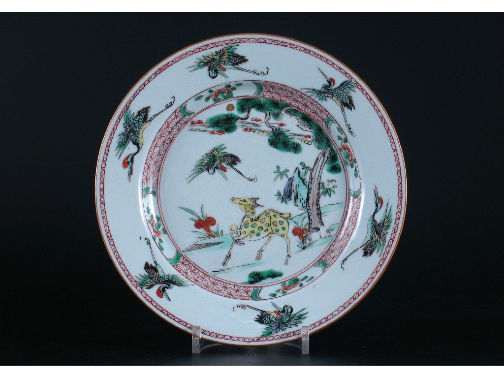 A Chinese famille verte plate, painted with a yellow spotty deer and a flying crane beneath a pine tree, the border with six further cranes, Kangxi 1662-1722, 22cm.