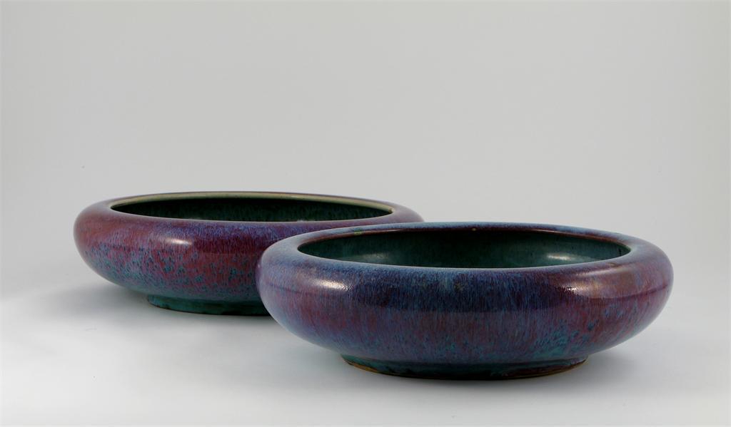 A good pair of Chinese flamb? glazed shallow bowls, each with an inverted rim, and decorated with a lustrous mottled glaze, c.1800, 30cm. (2)