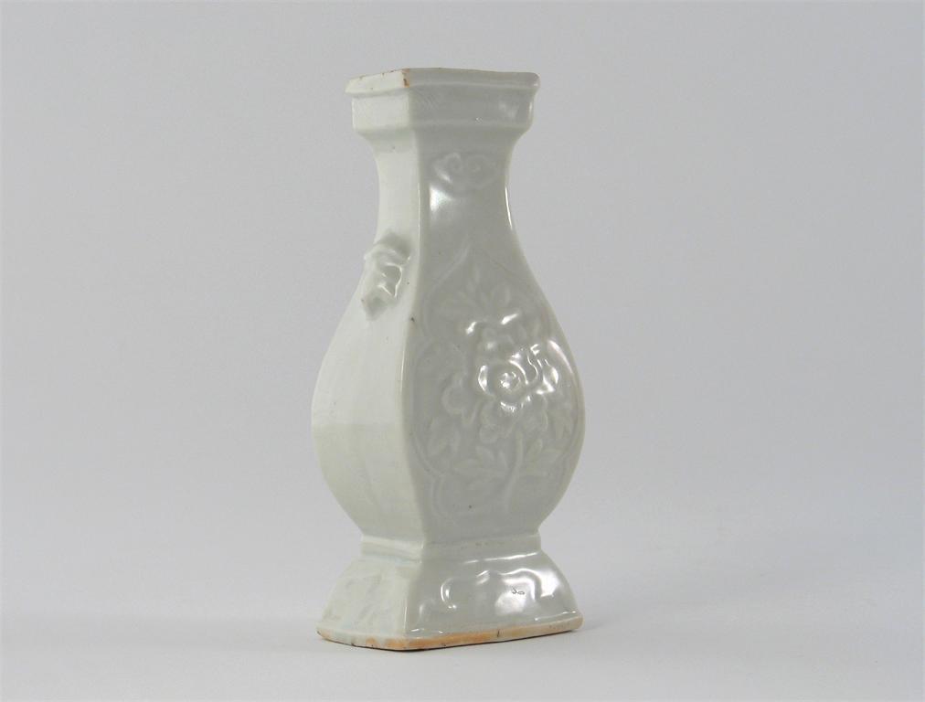 A Chinese blanc de Chine small square section baluster vase, moulded with peony and animal mask handles, 18th century, 14.5cm.