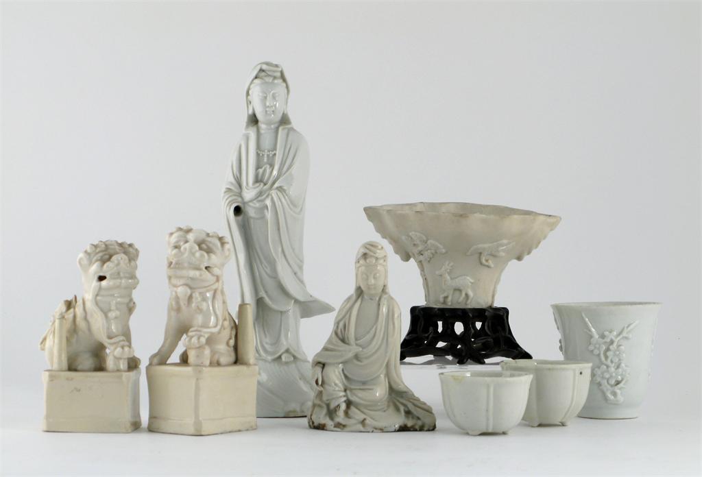A group of Chinese blanc de Chine items, including two lion dogs, two models of Guanyin, and four bowls, one with a wood stand, 18th century, damages, 23.5cm. (8)