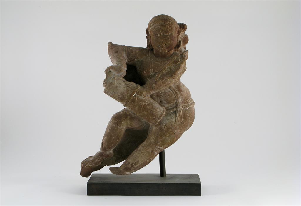 A sandstone carving of a female figure, dancing playing a drum, 42cm.