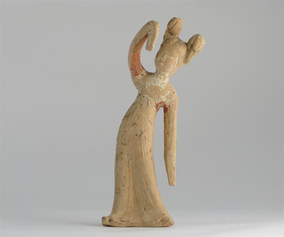 A Chinese pottery model of a woman, she stands in a dancing pose, traces of original pigment, Tang dynasty 618-907, 25cm. Together with an Oxford Authentication Thermoluminescence report, sample number C207F61.