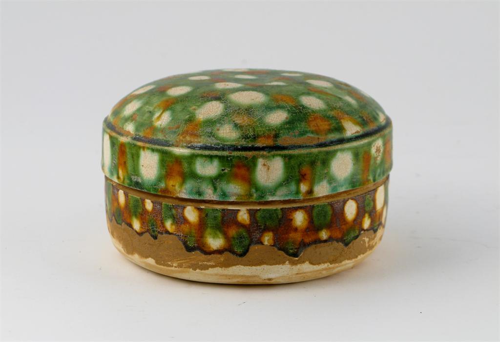 A Chinese sancai-glazed circular box and cover, decorated with a mottled glaze, Tang dynasty 618-907AD, chips, glaze wear and the lid possibly associated, 12cm. (2)