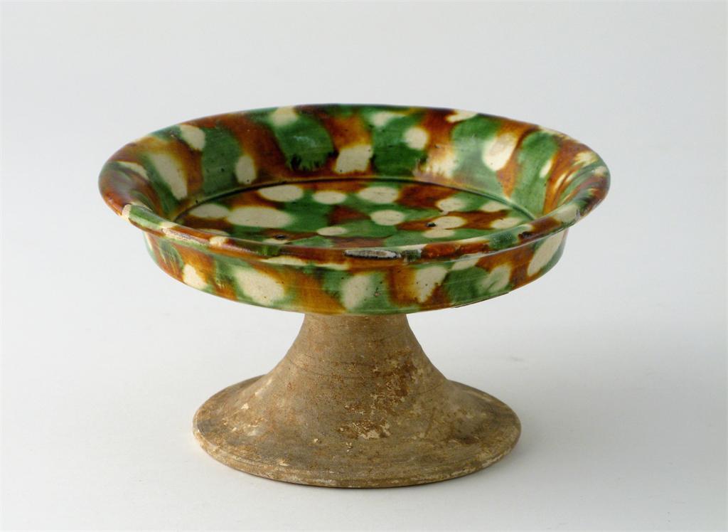 ** A Chinese sancai-glazed stand, dappled in green, white and ochre, no glazing to the stem, Tang dynasty 618-907 AD, minor damage and restoration, 13.5cm.