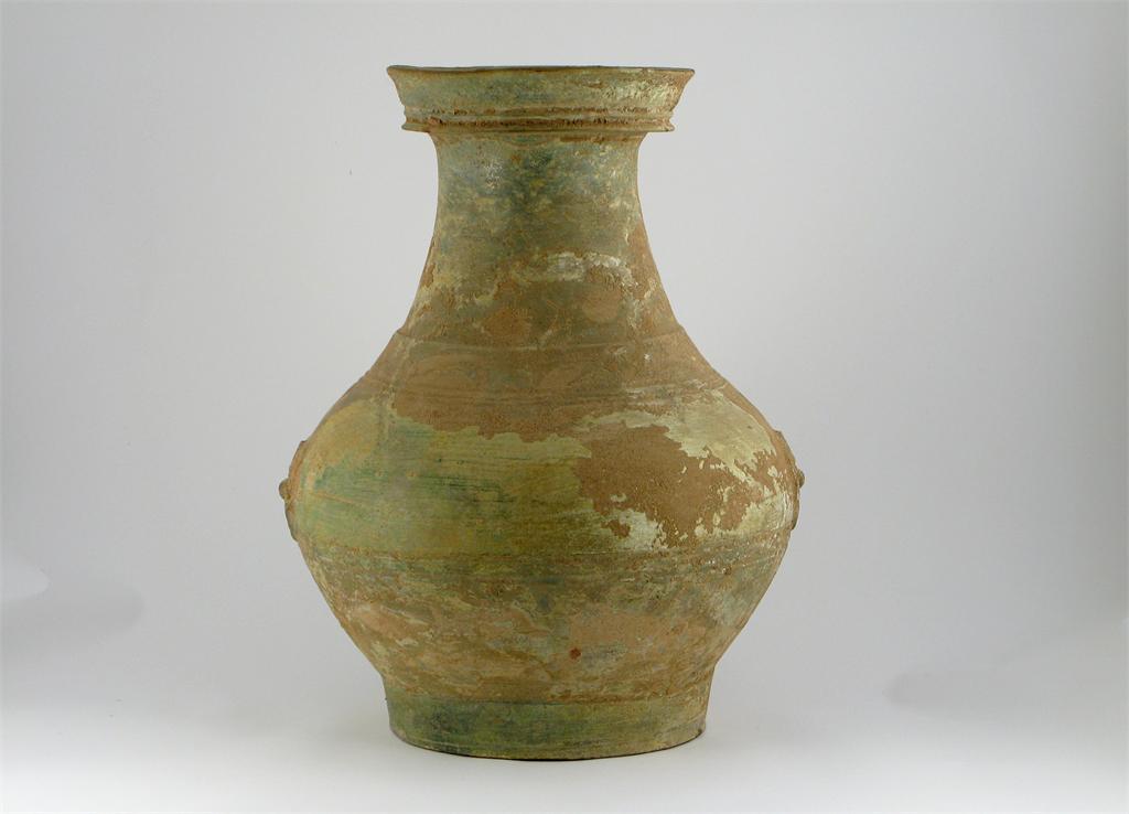 A large Chinese pottery vase, with moulded ring handles, and decorated with a degraded green lead glaze, Han dynasty 206BC-220AD, 45cm.