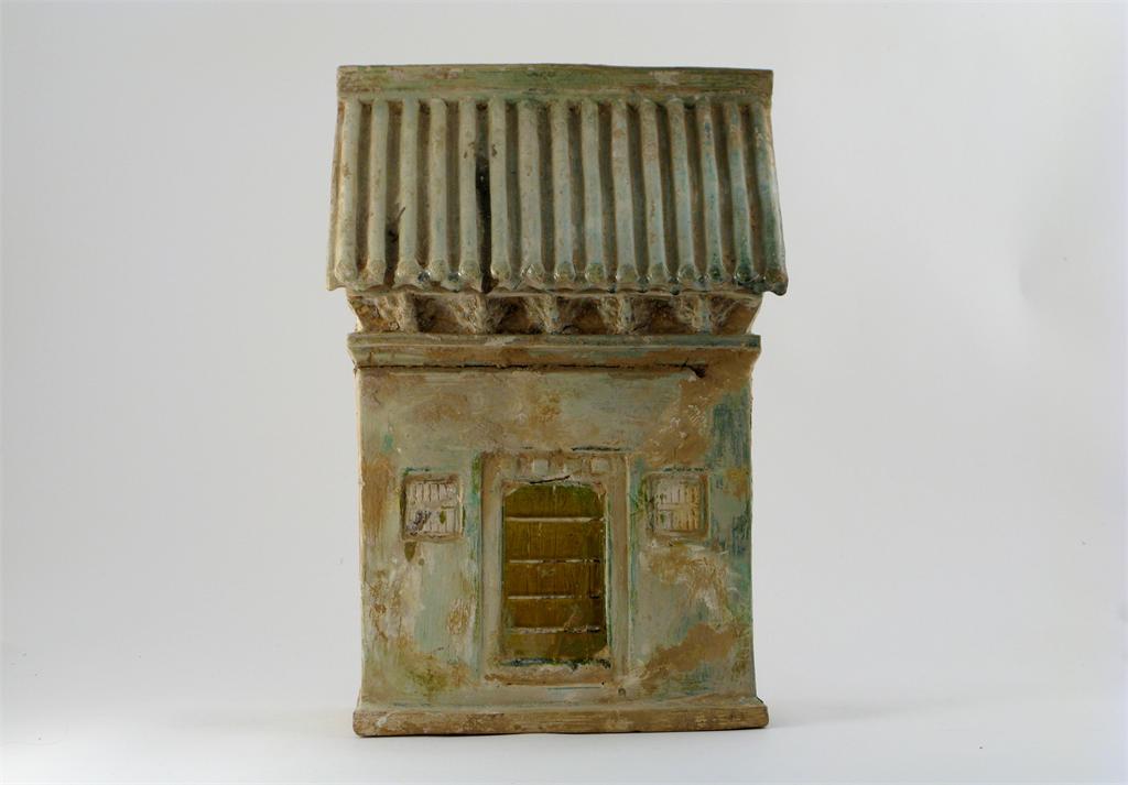 A Chinese pottery model of a house, with a ridged sloping roof and a door flanked by square windows, the surface with a lustrous degraded green glaze, Han dynasty 206BC - 220 AD, damaged and restored, 39cm.