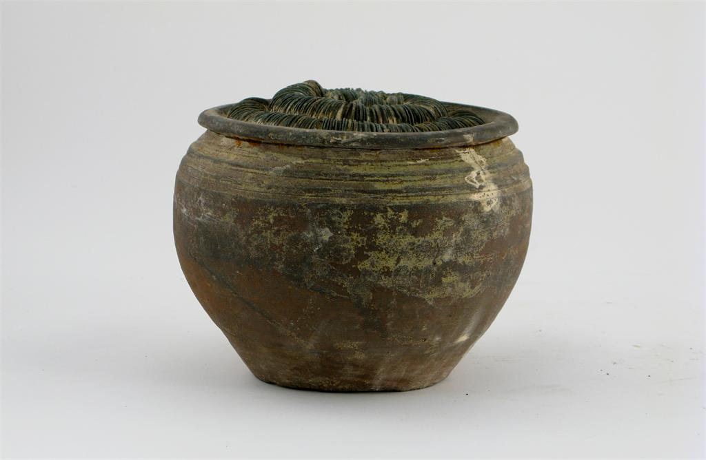 A rare Chinese pottery funerary jar of cash, filled with several thousand bronze coins arranged in concentric rings, Song dynasty, some damage to the foot, 15cm.