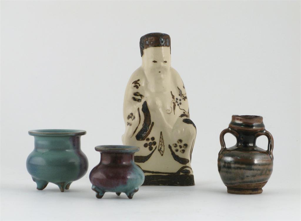 Two Junyao small tripod censers, and decorated with a purple splash on a lavender ground, a small brown glazed vase, and a Cizhou figure, Song dynasty and later, 18cm. (4)