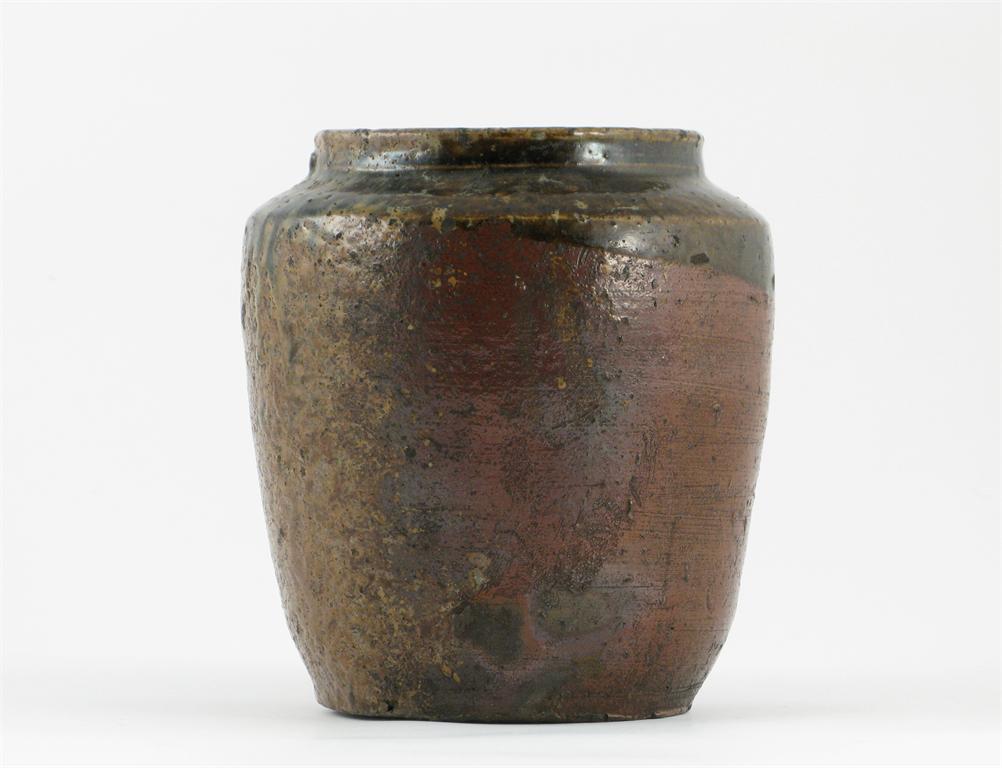 A Japanese Tamba ware jar or water pot, the neck and shoulders decorated with a greenish brown glaze, probably 18th century, 19cm. Paper label for W. Peer Groves.