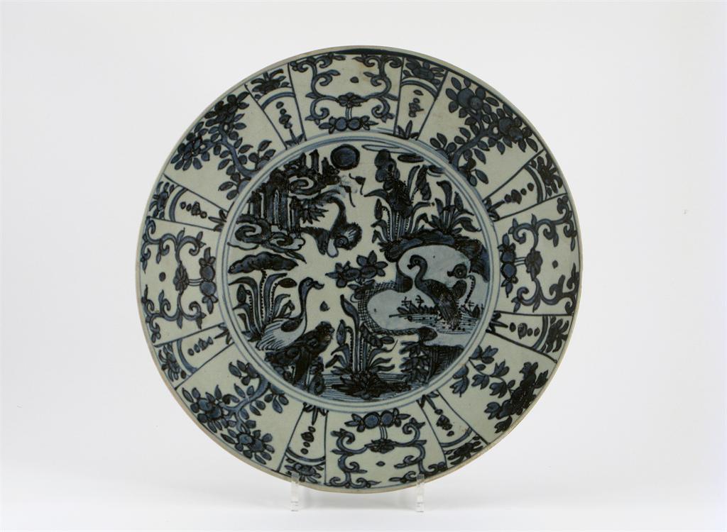A Chinese blue and white Swatow-type dish, painted with ducks amidst aquatic plants within a wide panelled border design, minor damage and repairs, c.1600, 37cm. Cf. J. Welsh, Zhangzhou Export Ceramics, pp.75-77 a related example.
