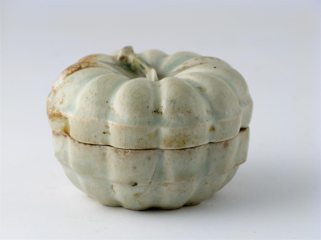A Chinese qingbai box and cover, formed as a fruit, the knop as a stalk, the base with a moulded four character mark, Song dynasty 960-1279, damaged, 7.5cm. (2)
