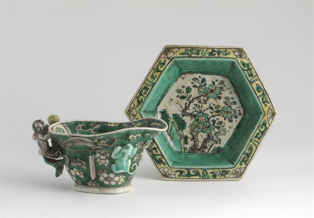 A Chinese famille verte helmet cup and dish, the cup applied with four mythological dragons, the centre painted with a rabbit, the dish of hexagonal form decorated with a gnarled blossoming tree, Kangxi 1662-1722, the cup interior with firing faults, 11cm. (2)