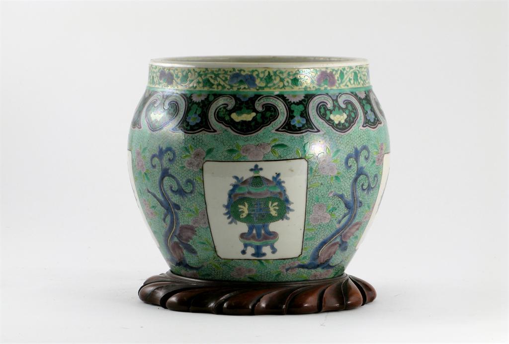 A Chinese famille verte jardini?re, painted with four panels containing censers on a green ground with mythical beasts amidst flowers, 19th century, body cracks, 27cm, together with a turned and carved wood stand. (2)