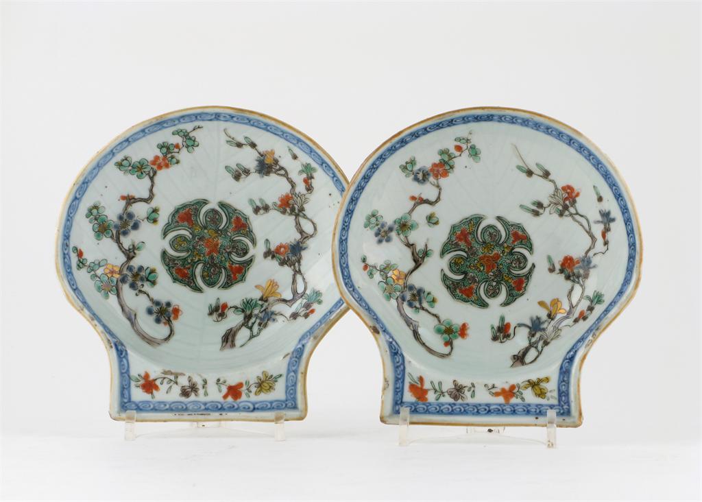 A pair of Chinese famille verte shell dishes, moulded to imitate a leaf's veins, painted with blossoming branches and shaped roundels, surrounded by an underglaze blue scroll border, Kangxi 1662-1722, minor damages, 16.3cm. (2)