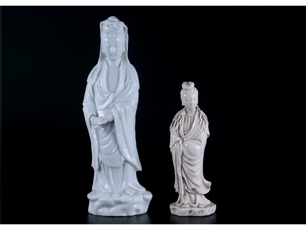 Two Chinese blanc de Chine standing figures of Guanyin. Small chips. 18th century