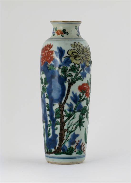 A Chinese wucai cylindrical vase, typically decorated with flowers and rockwork, mid 17th century, restoration to the neck, 23cm.