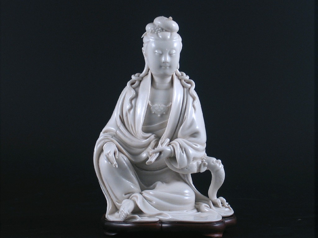 A Chinese blanc de Chine model of Guanyin, seated holding a tied scroll and raised on a hardwood stand, impressed seal mark Firing faults and minor damage. 18th century, 21.5cm. (2)