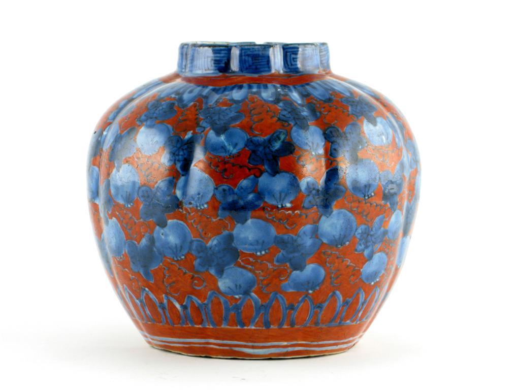 ** A Chinese moulded ovoid vase, decorated with fruiting gourd vines in blue, later detailed with a coral red ground, 17th century, minor damage, 19cm.