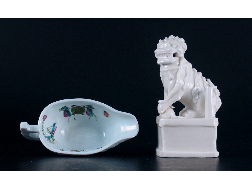 A Chinese blanc de Chine joss-stick holder, mounted with a dog of Fo on a rectangular plinth, Kangxi, and a famille rose libation vessel, painted with wasps, crickets and a praying mantis, 18th century, probably Fukien, 14cm. (2)