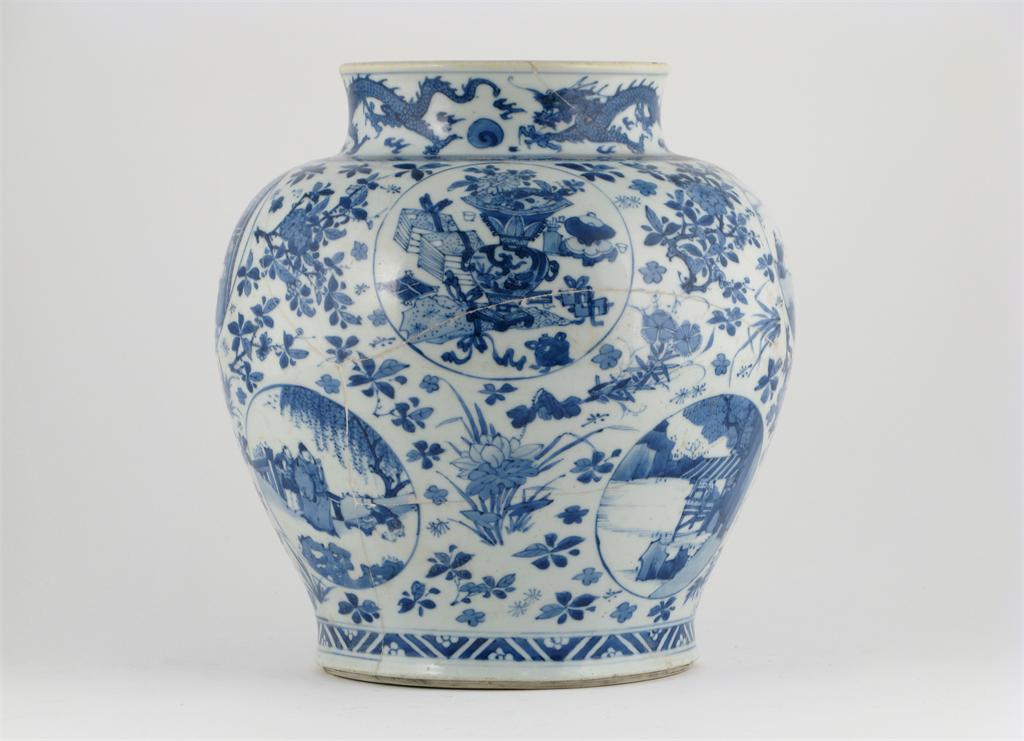 A Chinese blue and white baluster vase, painted with roundels of figures and vases on a ground of flowers and leaves, a six character Chenghua mark but Kangxi 1662-1722, extensively damaged and repaired, 26cm.