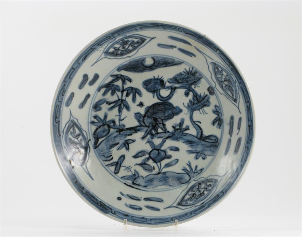 A Chinese Swatow-type blue and white dish, crudely painted with flowers and foliage, early 17th century, restored, 26cm. Bears a paper label for the Binh Thuan Shipwreck.